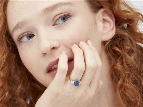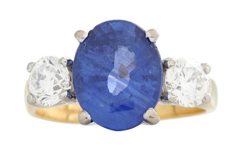 Centring a claw-set oval-cut sapphire weighing approximately 3.00 carats, flanked by claw-set brilliant-cut diamonds together weighing approximately 0.50 carats, size I 1/2.