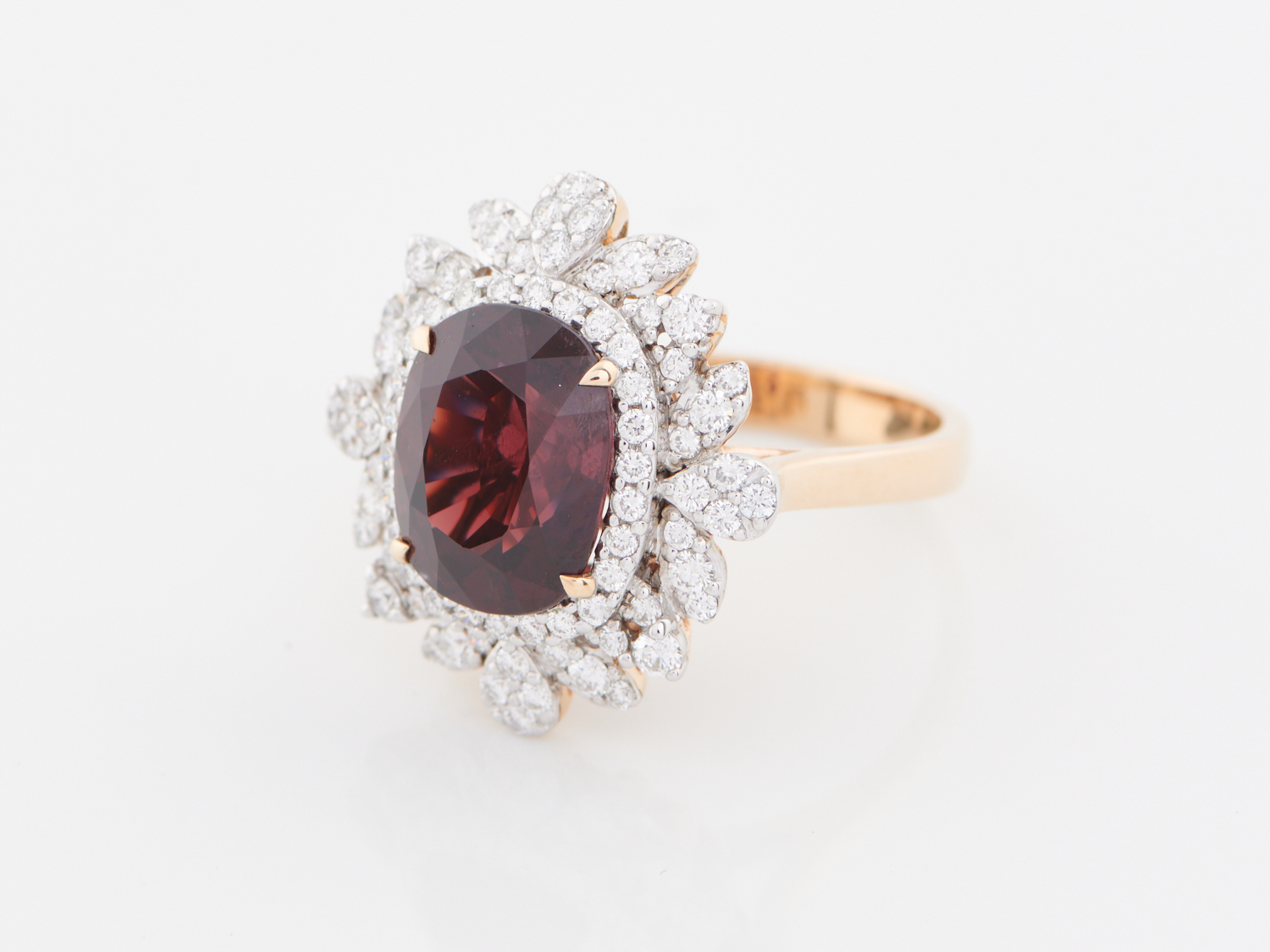 A RED SPINEL AND DIAMOND RING IN 14CT TWO TONE GOLD. THE SPINEL WEIGHING 5.82CTS, THE DIAMONDS WEIGHING 0.95CTS, SIZE P