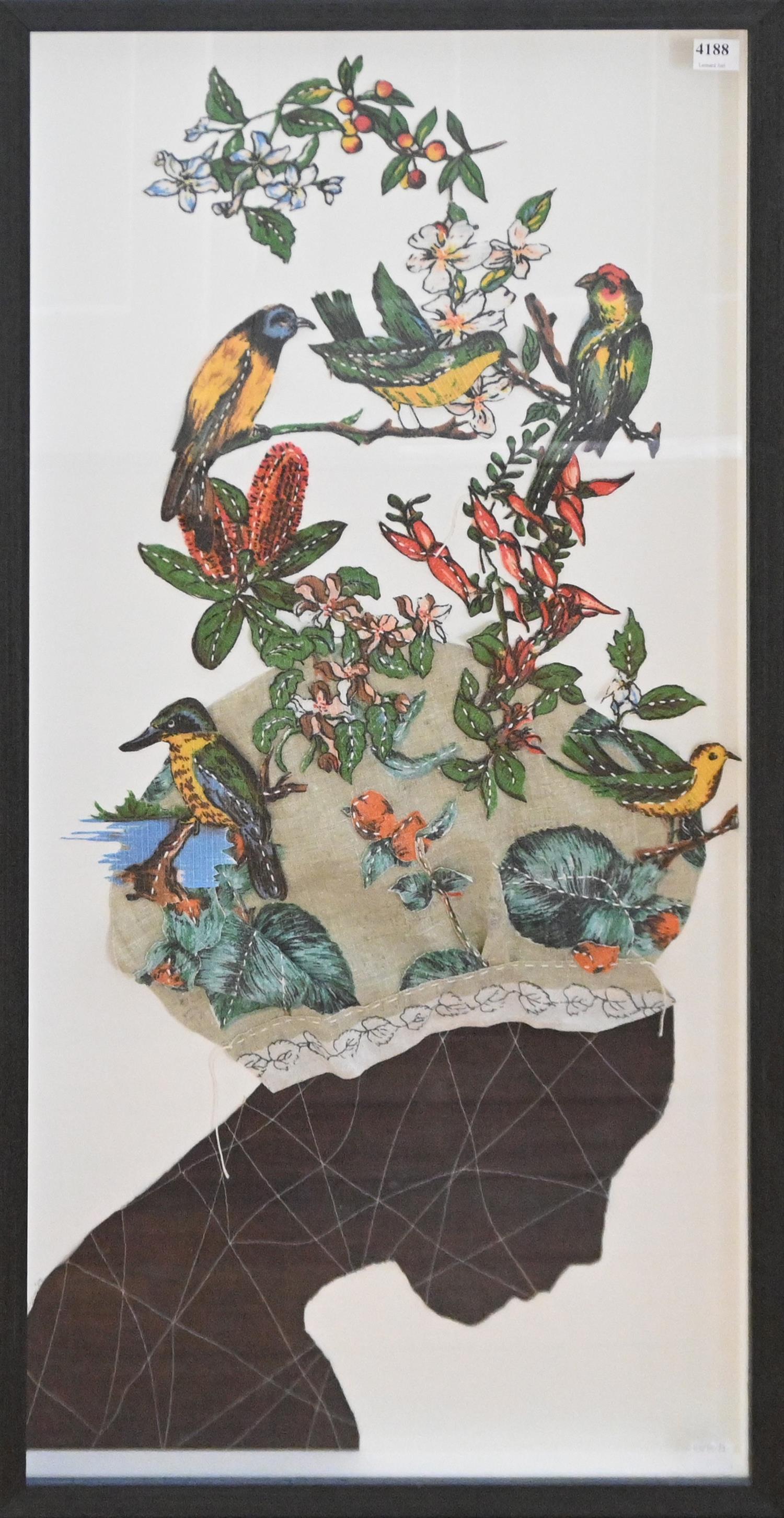 § ANN RYAN, THE BIRD SOUVENIR 2019, FABRIC AND THREAD, SIGNED AND DATED LOWER LEFT, 79.5 X 39CM, FRAME SIZE: 84 X 43CM