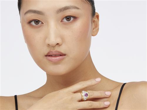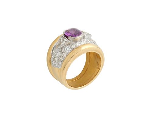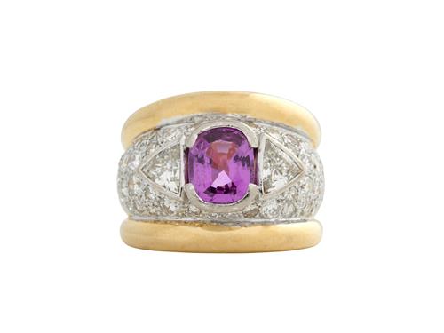 The wide band centring a semi-bezel set oval-cut pink sapphire weighing approximately 1.40 carats, flanked by bezel-set trilliant-cut diamonds within a pavé-set diamond surround, the diamonds together weighing approximately 1.50 carats, size M-N.