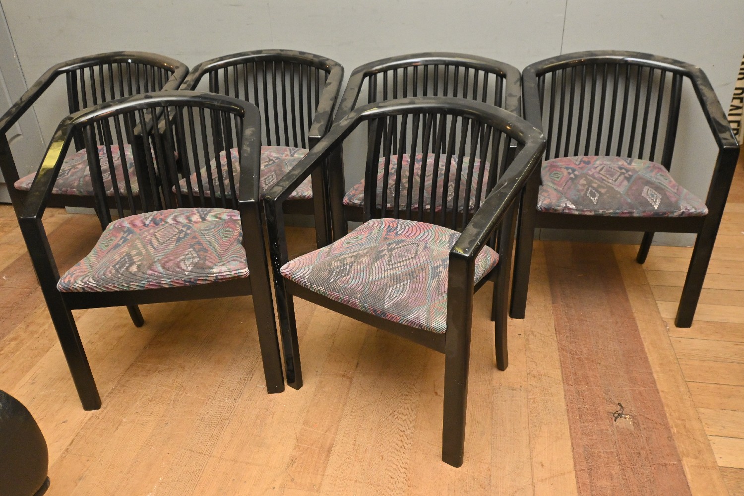 A SET OF SIX 1980s BLACK-LACQUERED ELBOW CHAIRS (A/F) (80H X 61W X 60D CM) (LEONARD JOEL DELIVERY SIZE: X-LARGE)