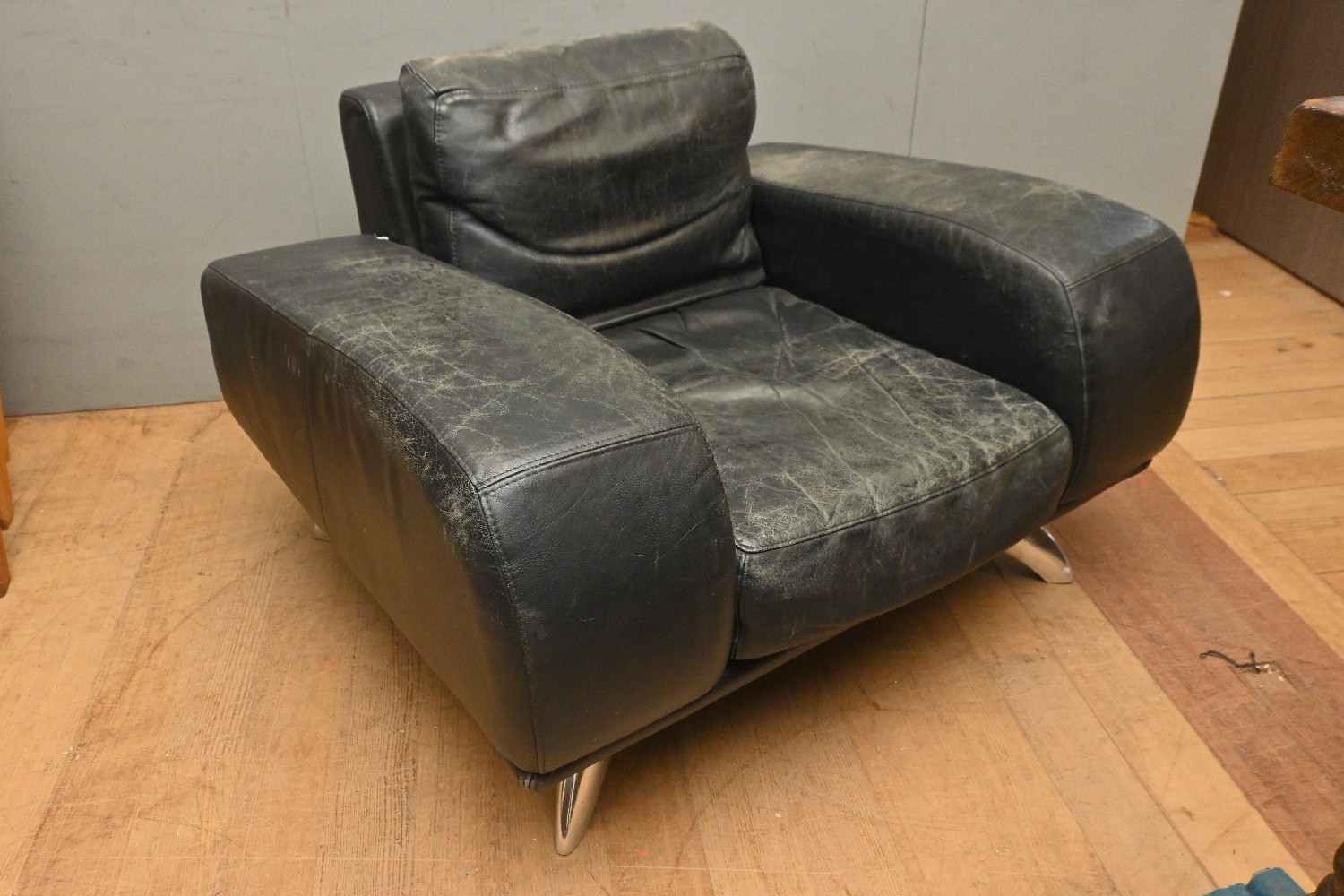 A MODERNIST LEATHER-UPHOLSTERED CLUB CHAIR (A/F) (65H X 102W X 89D CM) (PLEASE NOTE THIS HEAVY ITEM MUST BE REMOVED BY CARRIERS AT THE CUSTOMER'S EXPENSE. LEONARD JOEL STAFF CANNOT ASSIST CARRYING THIS ITEM) (X-LARGE ITEM)