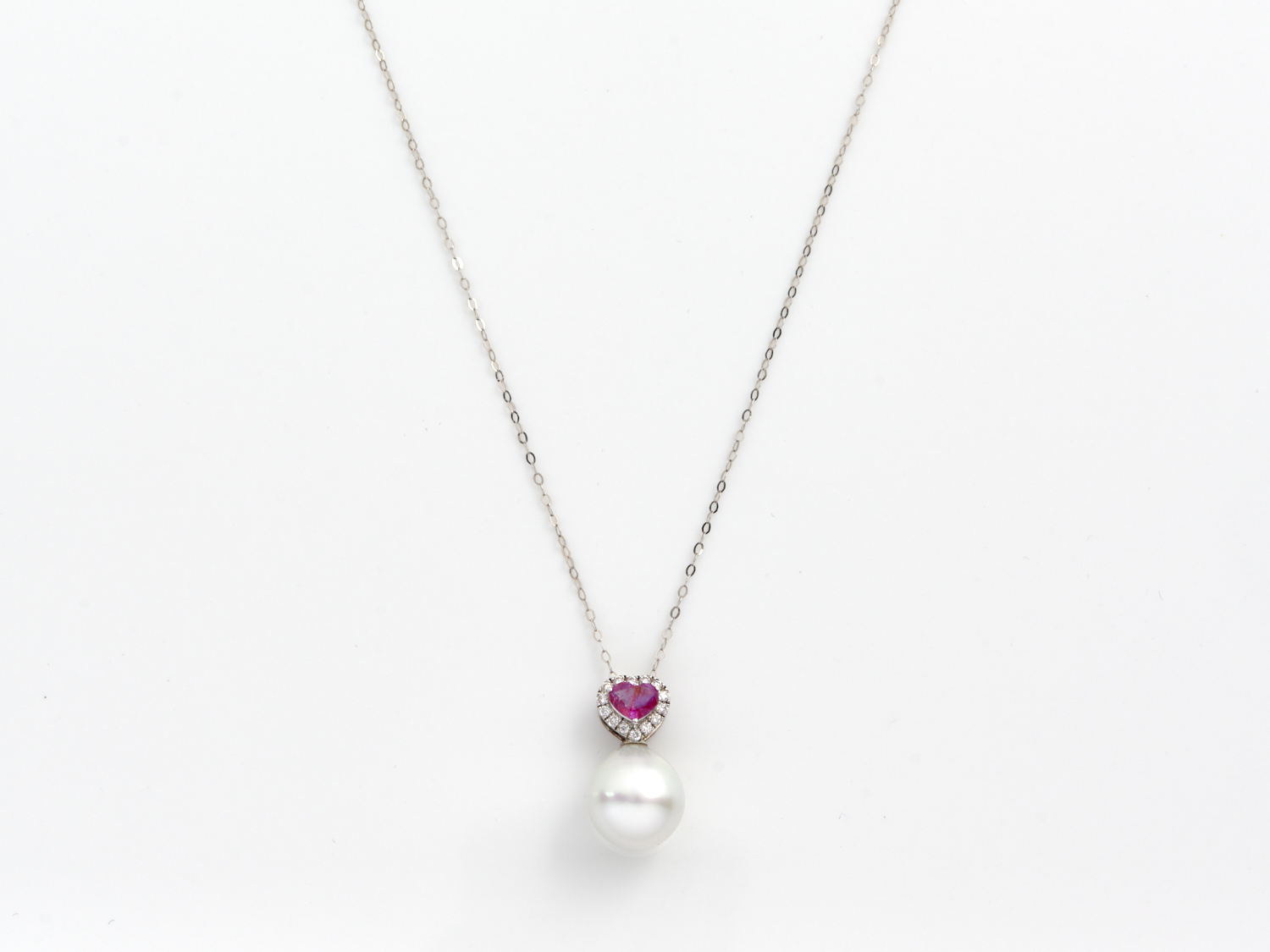 AN UNHEATED RUBY, DIAMOND AND SOUTH SEA PEARL NECKLACE IN 18CT WHITE GOLD, THE PEAL MEASURING APPOXIMATELY 11MM