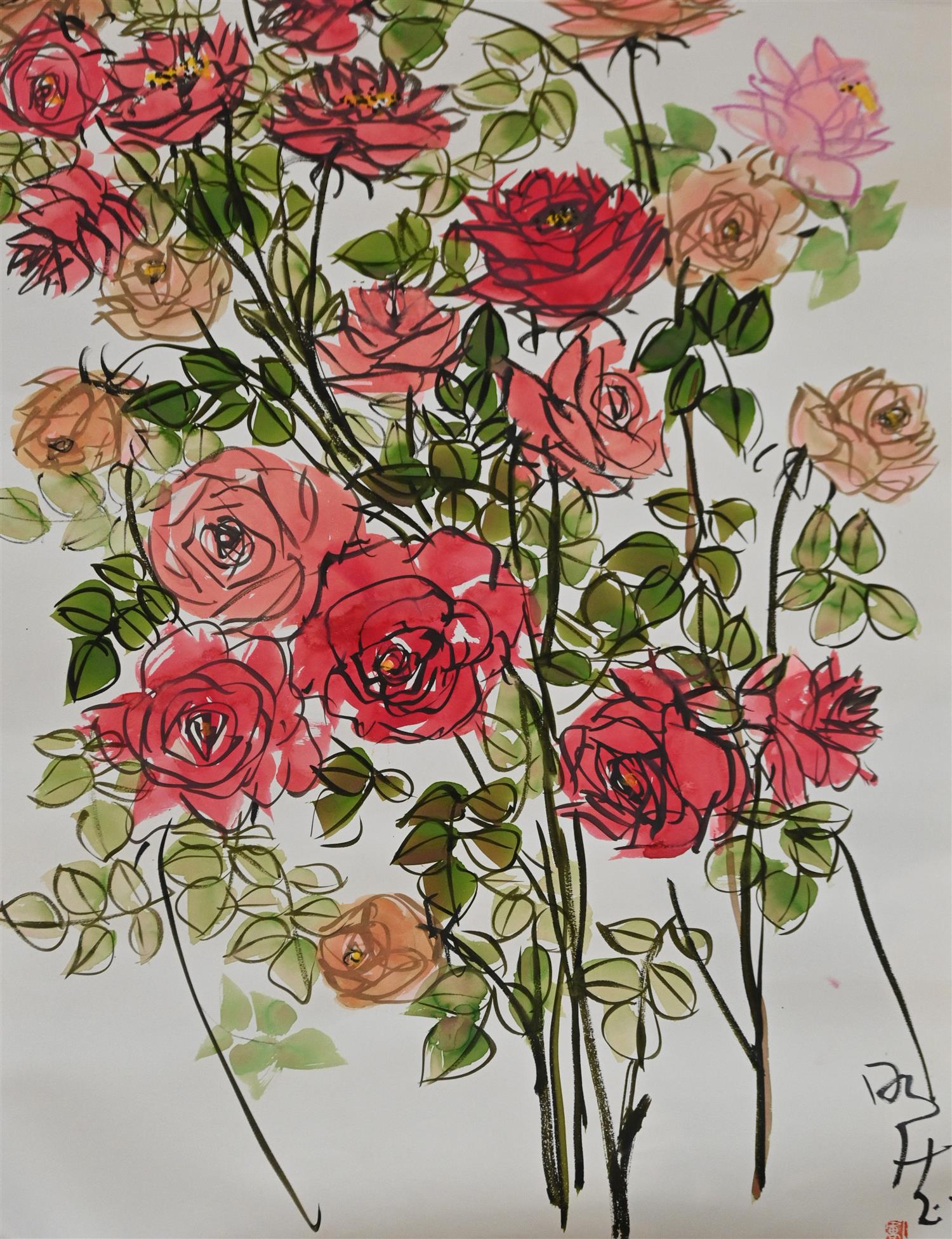 EARL LU, ROSES, MIXED MEDIA ON PAPER, SIGNED LOWER RIGHT IN CHARACTERS WITH ARTIST'S SEAL, 76 X 56CM