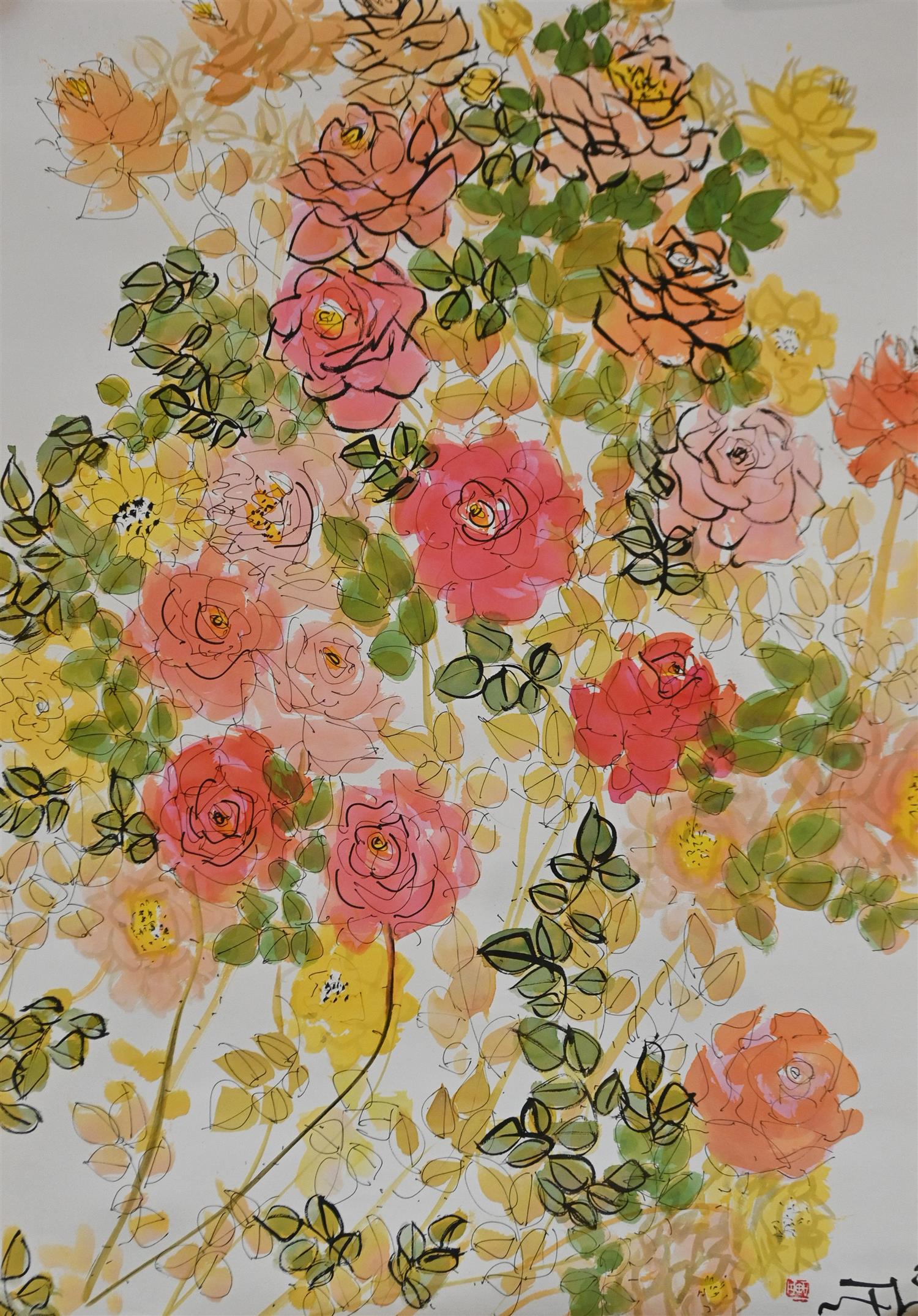 EARL LU, YELLOW AND ORANGE ROSES, INK AND WATERCOLOUR ON PAPER, SIGNED LOWER RIGHT IN CHARACTERS WITH ARTIST'S SEAL, 76 X 56CM