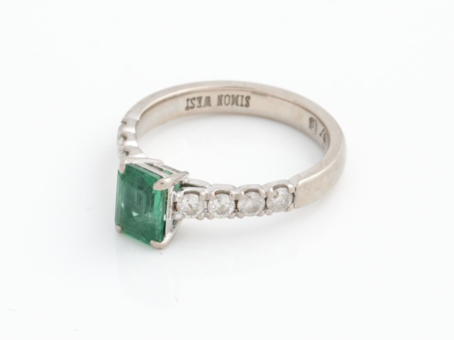 SIMON WEST, AN EMERALD AND DIAMOND RING IN 18CT WHITE GOLD, THE EMERALD WEIGHING 0.81CTS, THE DIAMONDS TOTALLING 0.40CTS, SIZE L
