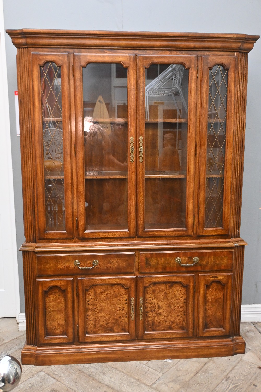 A HARDWOOD AND GLAZED BOOK-CASE CABINET, THE DOORS OF THE LOWER PART VENEERED WITH BURR WOOD (A/F) (201H X 144W X 41D CM) (PLEASE NOTE THIS HEAVY ITEM MUST BE REMOVED BY CARRIERS AT THE CUSTOMER'S EXPENSE. LEONARD JOEL STAFF CANNOT ASSIST CARRYING THIS ITEM) (X-LARGE ITEM)