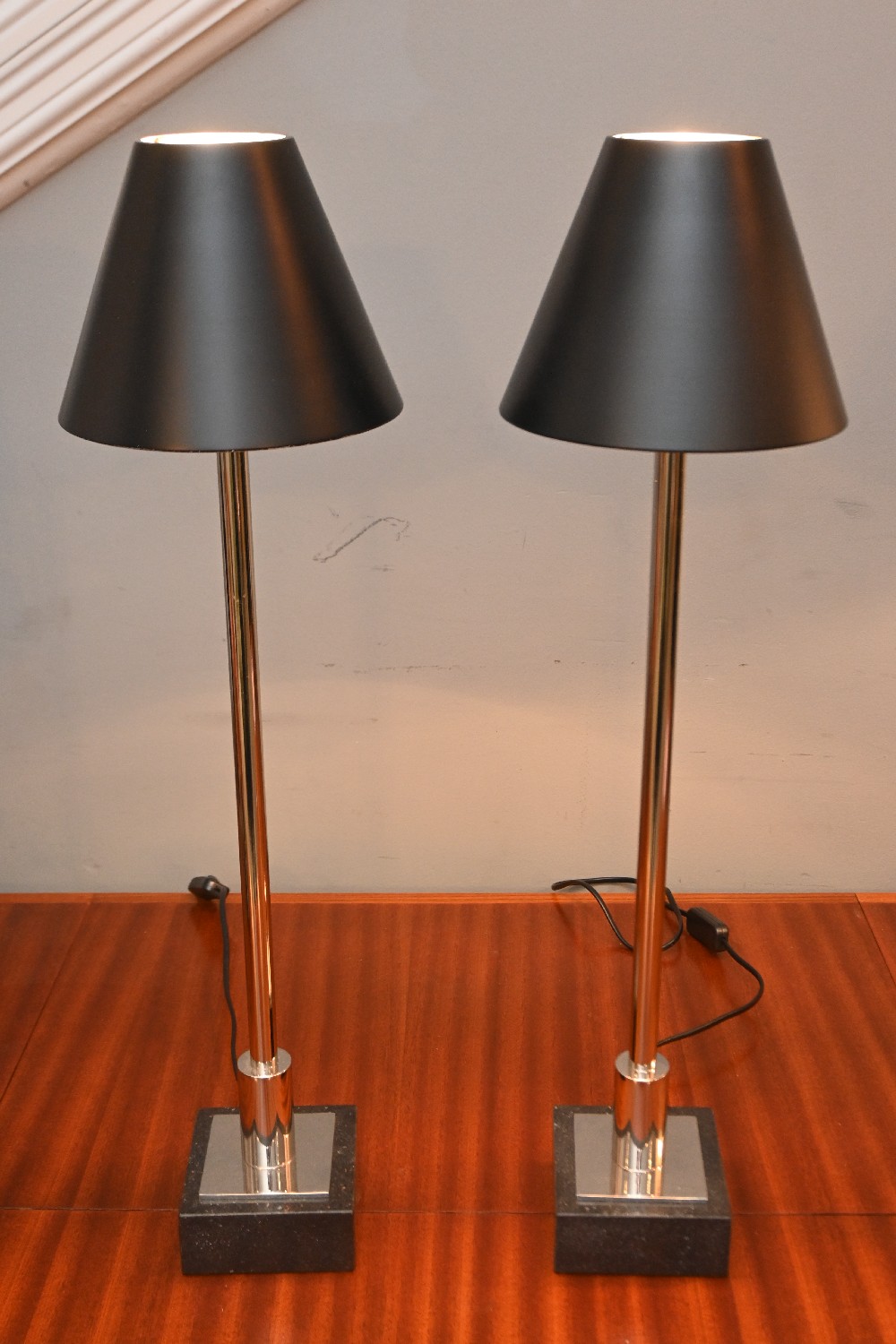 A PAIR OF CHROME AND MARBLE DECO STYLE LAMPS WITH METAL SHADES (74H X 21D CM) (LEONARD JOEL DELIVERY SIZE: LARGE)