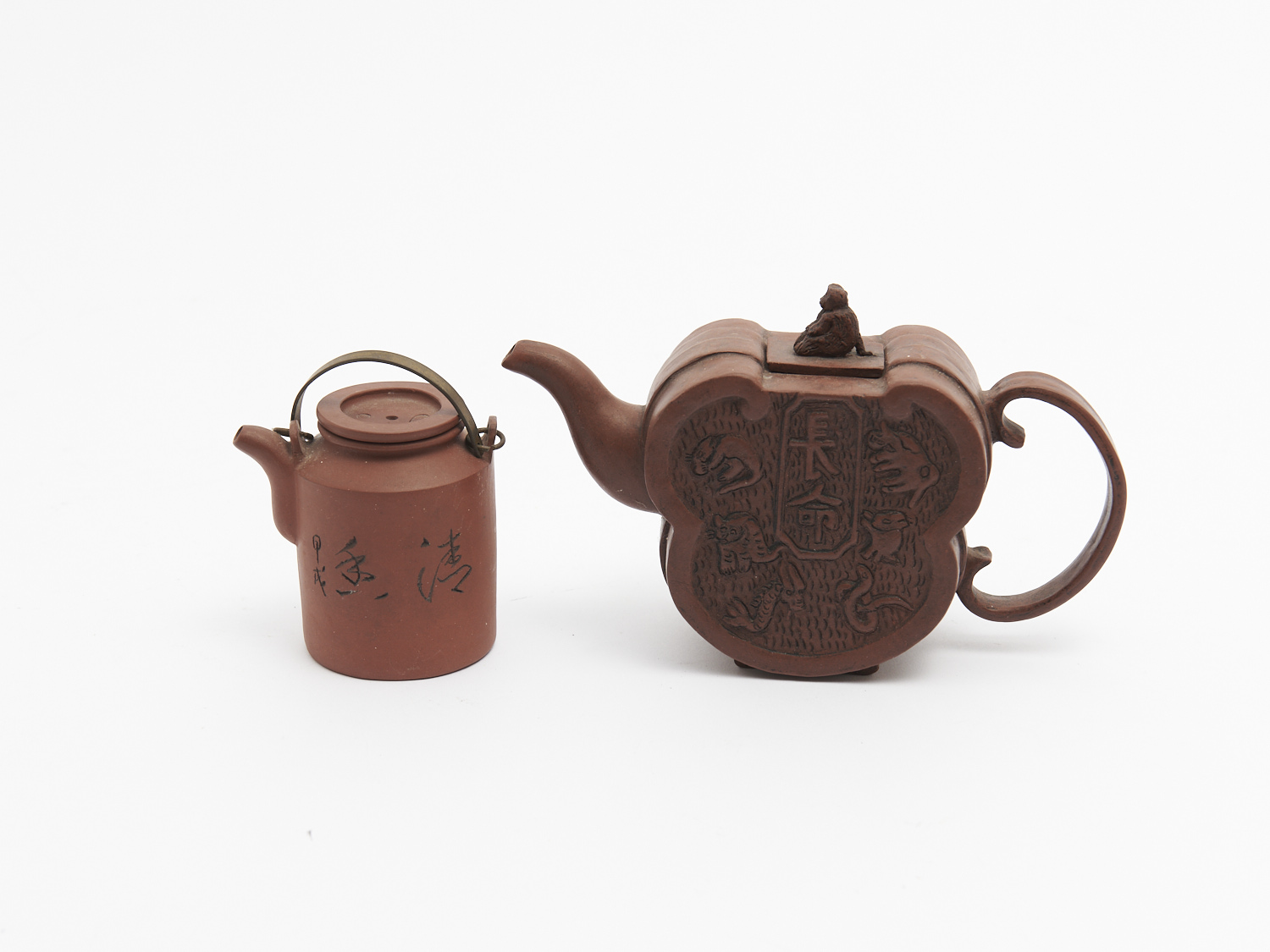TWO CHINESE TERRACOTTA SIGNED TEAPOTS H.12CM (TALLEST), LEONARD JOEL LOCAL DELIVERY: SMALL