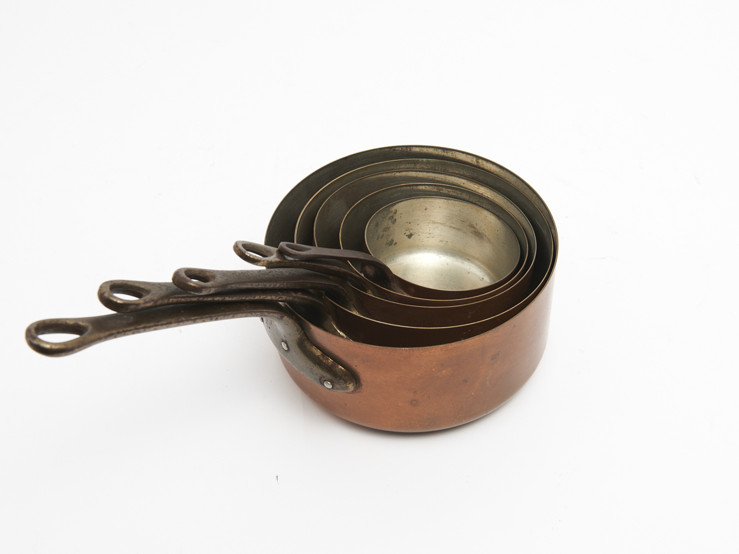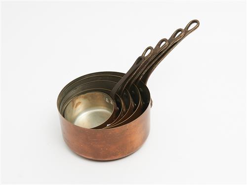 A SET OF FIVE GRADUATED 19TH CENTURY SIGNED FRENCH COPPER AND CAST IRON SAUCEPANS DIA.18CM (LARGEST), LEONARD JOEL LOCAL DELIVERY: MEDIUM