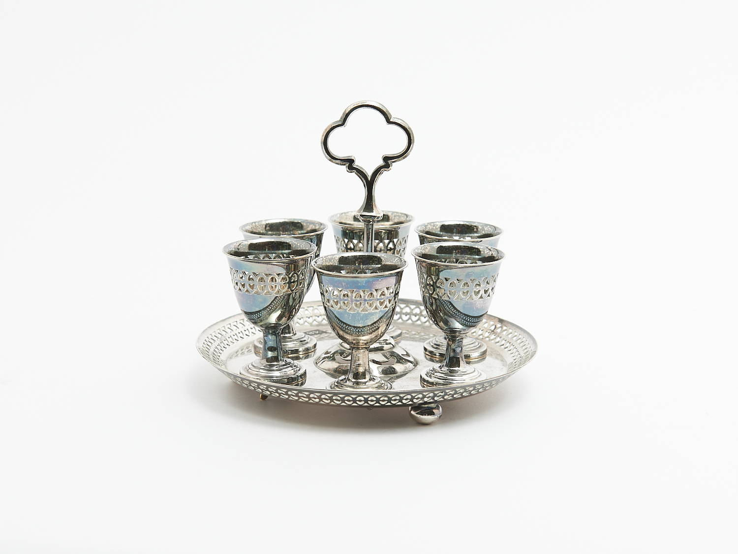 A SILVER PLATE EGG HOLDER STAND OF SIX EGG CUPS DIA.18CM, LEONARD JOEL LOCAL DELIVERY: SMALL