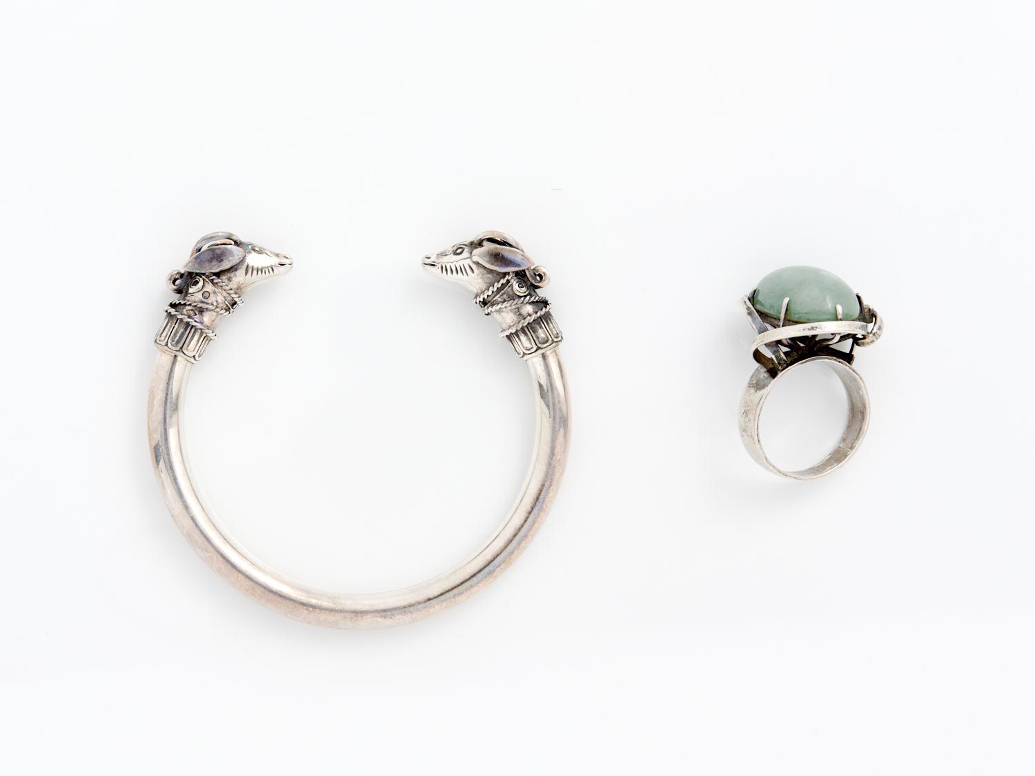A RAMS HEAD BANGLE IN STERLING SILVER, TOGETHER WITH A GREEN STONE SET RING IN SILVER, SIZE P