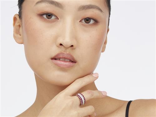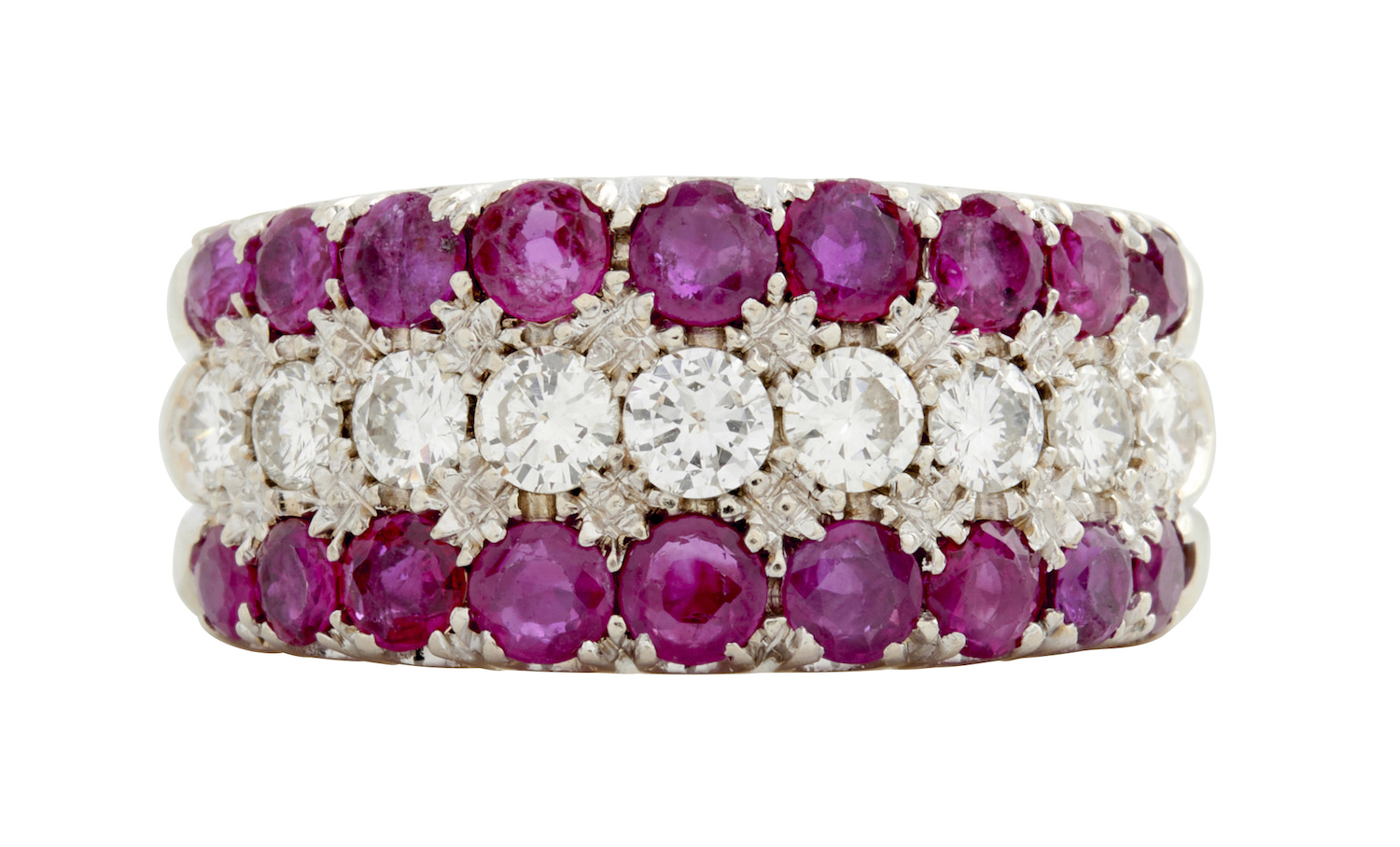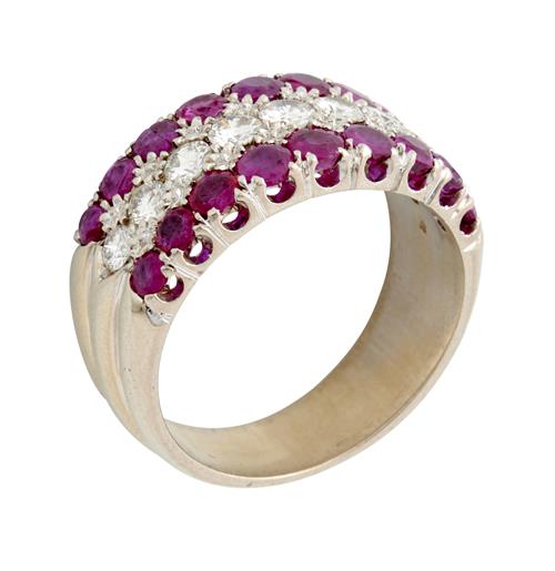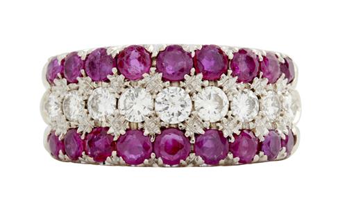 Of half hoop design, centring a row of nine brilliant-cut diamonds together weighing approximately 0.60 carats, flanked by rows of circular-cut rubies together weighing approximately 1.20 carats, size P.