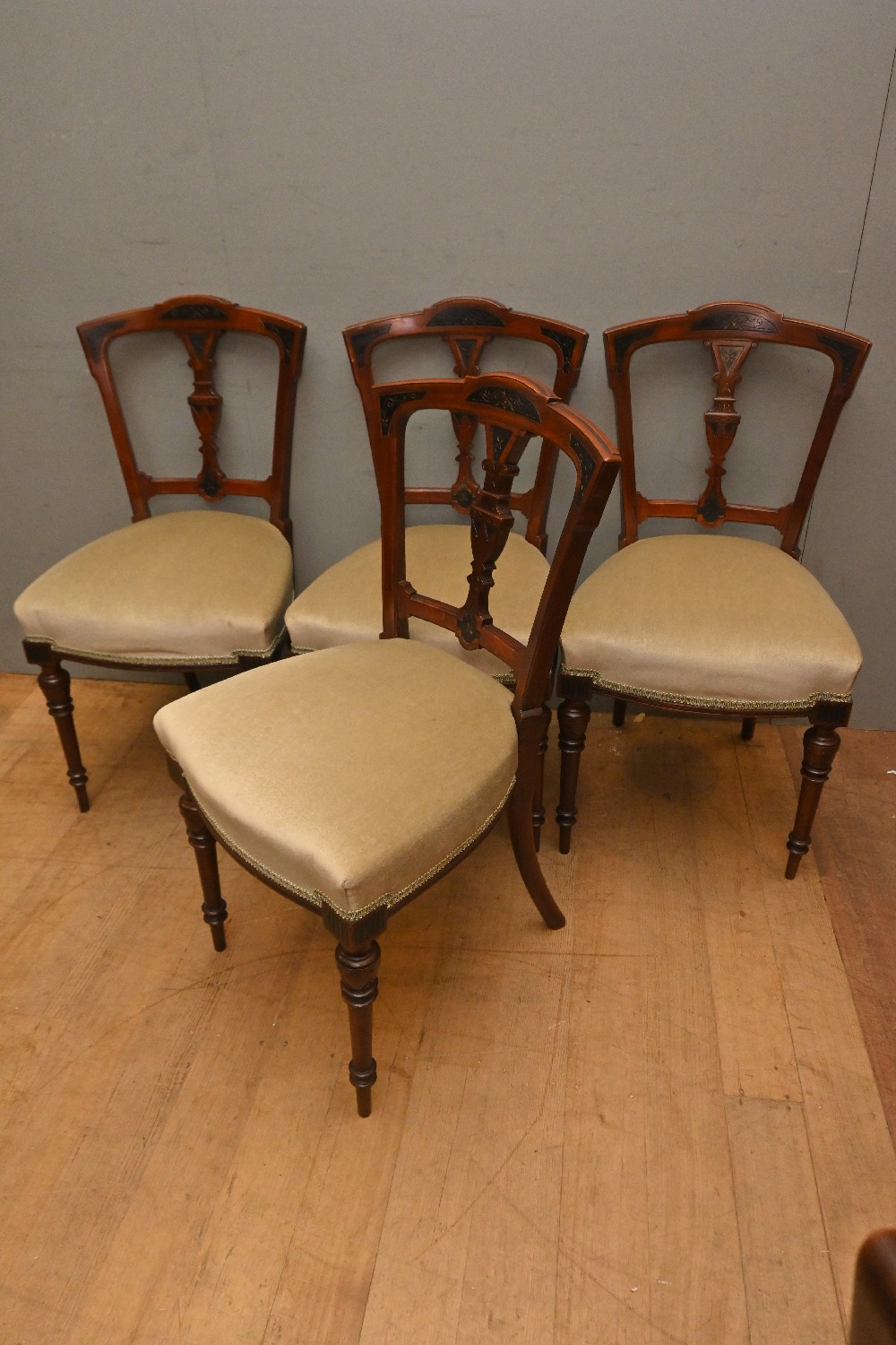 A SET OF FOUR VICTORIAN UPHOLSTERED DINING CHAIRS (88H X 56W X 52D CM) (LEONARD JOEL DELIVERY SIZE: LARGE)