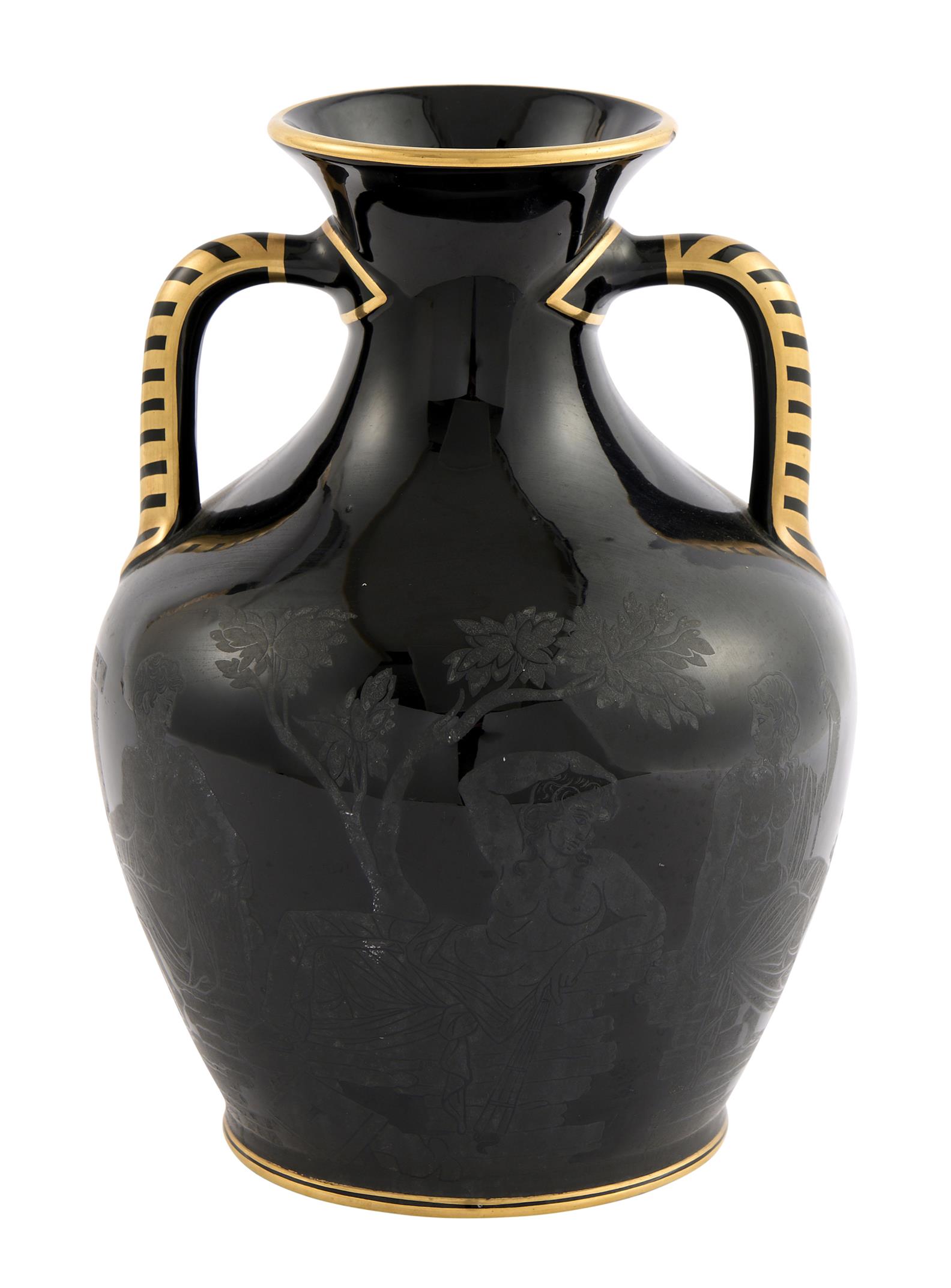 A CLASSICAL STYLE AMPHORA WITH PRINTED GRECIAN STYLE SCENES AND GILDED HIGHLIGHTS (A/F), 26.5CM HIGH, LEONARD JOEL LOCAL DELIVERY: SMALL.