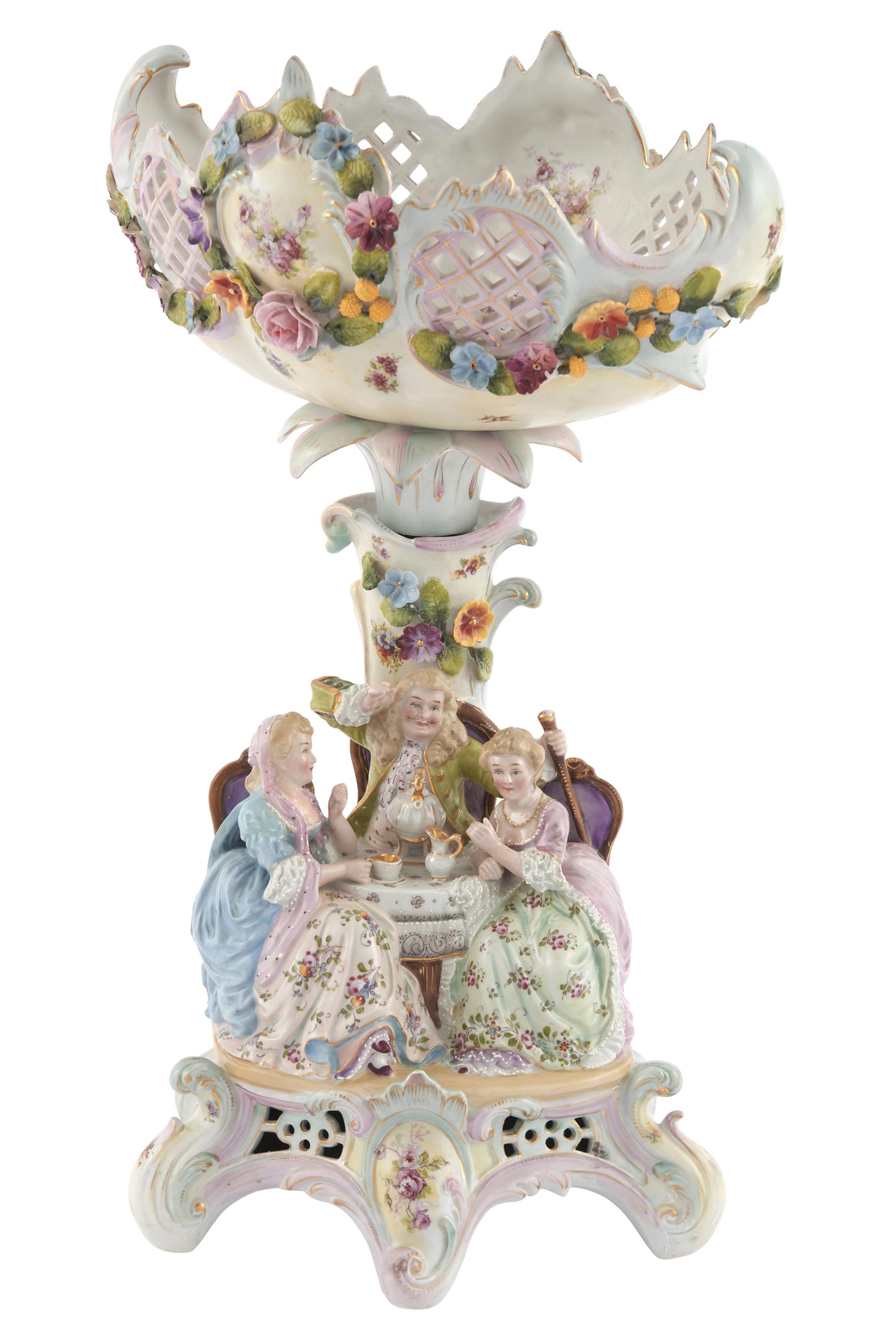 A CONTINENTAL PORCELAIN FIGURAL COMPORT (A/F), 47CM HIGH, LEONARD JOEL LOCAL DELIVERY: MEDIUM.