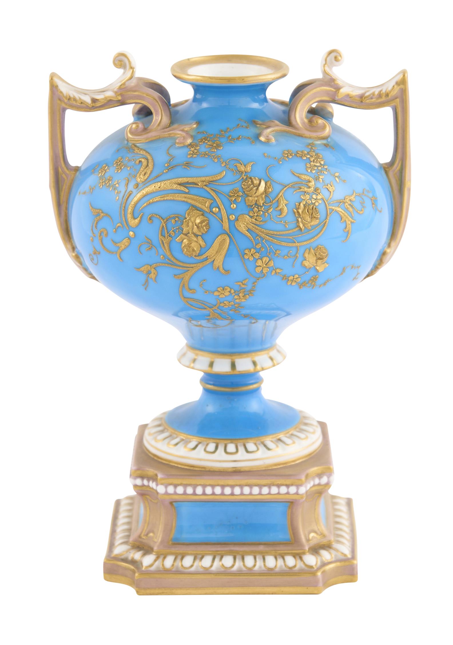 A ROYAL WORCESTER PORCELAIN VASE, CELESTE BLEU WITH GILT DECORATION, H.19CM, LEONARD JOEL LOCAL DELIVERY: SMALL.