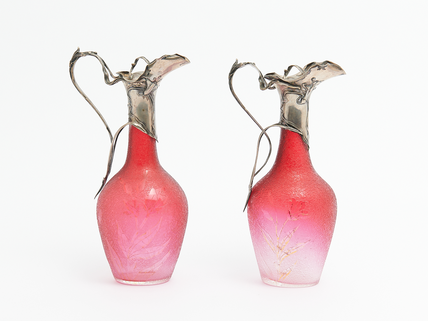 A PAIR OF GERMAN ART NOUVEAU 800 SILVER MOUNTED RUBY GLASS JUGS, H.20CM, LEONARD JOEL LOCAL DELIVERY: MEDIUM.