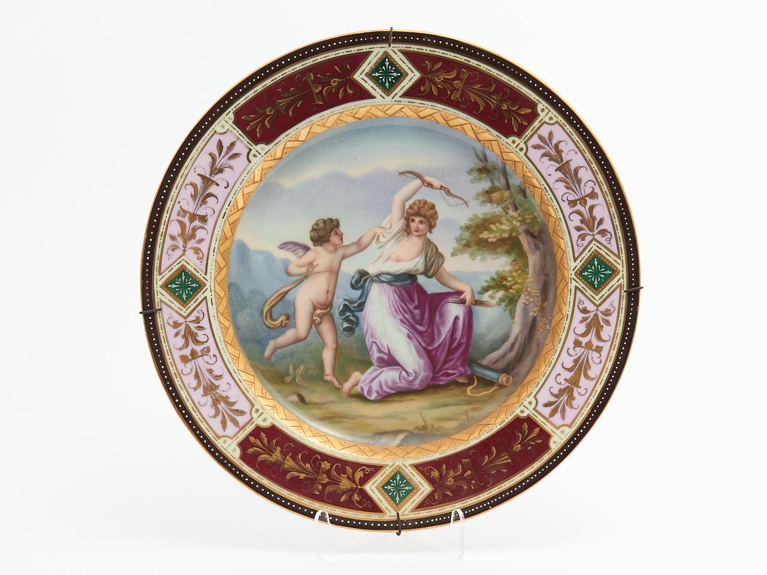 A ROYAL VIENNA STYLE PORCELAIN CHARGER, DECORATED WITH A SCENE OF CUPID WITH VENUS AT PLAY, CIRCA 1900 DIA.31CM, LEONARD JOEL LOCAL DELIVERY: SMALL.