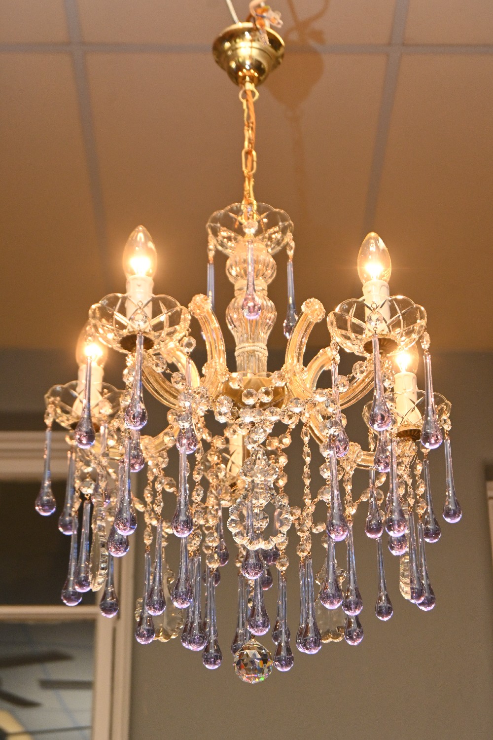 A FIVE BRANCH VENETIAN MARIE TERESE ALEXANDRITE MURANO CHANDELIER (80H X 48DIA CM) (PLEASE NOTE THIS HEAVY ITEM MUST BE REMOVED BY CARRIERS AT THE CUSTOMER'S EXPENSE. LEONARD JOEL STAFF CANNOT ASSIST CARRYING THIS ITEM) (X-LARGE ITEM)