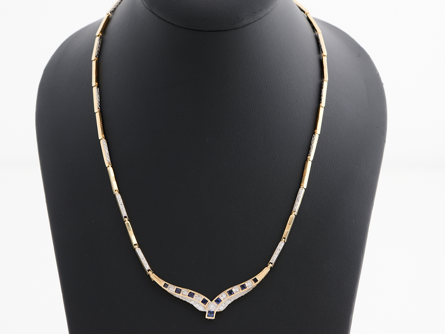 A SYNTHETIC SAPPHIRE AND WHITE STONE NECKLACE IN 14CT GOLD, LENGTH 460MM, 14.2GMS