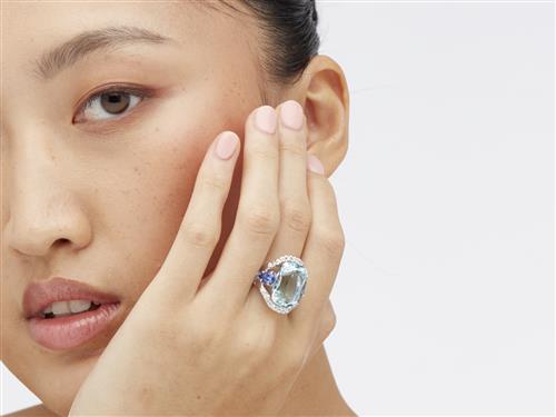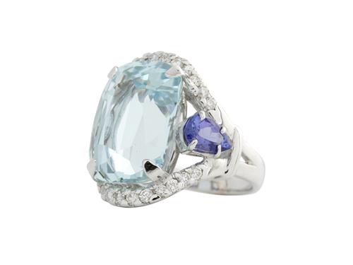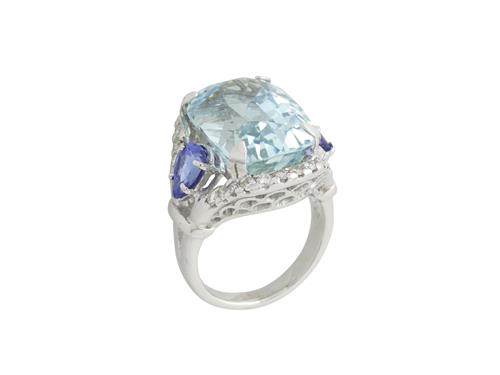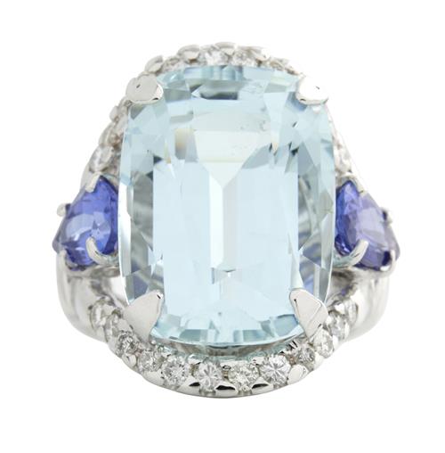 AN AQUAMARINE, TANZANITE AND DIAMOND RING IN 18CT WHITE GOLD, OF CLUSTER DESIGN, CENTRING A CLAW-SET CUSHION-CUT AQUAMARINE WEIGHING 14.85 CARATS, FLANKED BY PEAR-CUT TANZANITES TOGETHER WEIGHING APPROXIMATELY 1.70 CARATS, WITHIN A BORDER OF BRILLIANT-CUT DIAMONDS TOGETHER WEIGHING APPROXIMATELY 0.60 CARATS, SIZE M, ACCOMPAMIED BY VALUATION