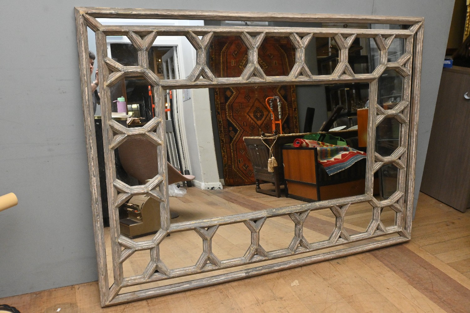 A WALL MIRROR IN A GEOMETRIC MOULDED AND SILVERED WOOD FRAME (A/F) (141H X 195W CM) (PLEASE NOTE THIS HEAVY ITEM MUST BE REMOVED BY CARRIERS AT THE CUSTOMER'S EXPENSE. LEONARD JOEL STAFF CANNOT ASSIST CARRYING THIS ITEM) (X-LARGE ITEM)