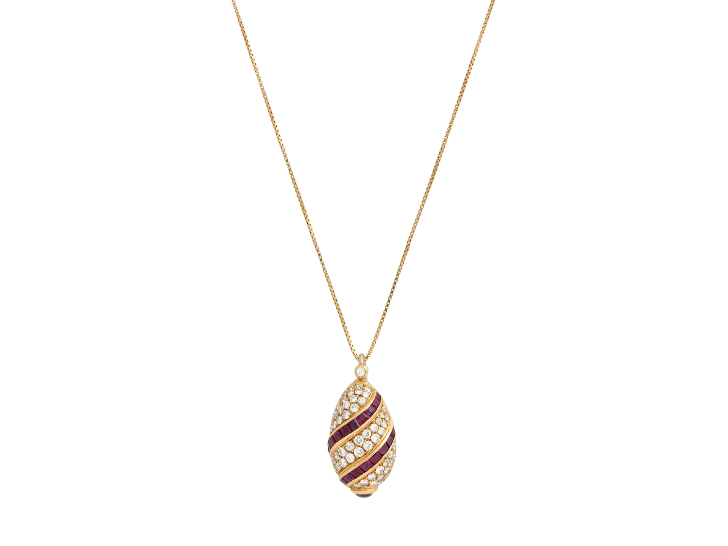 The drop shaped pendant set throughout with brilliant-cut diamonds together weighing approximately 1.40 carats, detailed with carre-cut rubies and a single cabchon ruby together weighing approximately 1.00 carat, suspended from a fine box link chain completed by a bolt ring clasp, pendant length approximately 32mm, chain length approximately 660mm.
