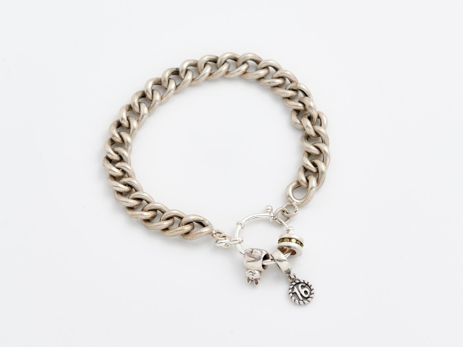 A VINTAGE FRENCH CURB LINK BRACELET IN SILVER, TOGETHER WITH THREE CHARMS IN SILVER