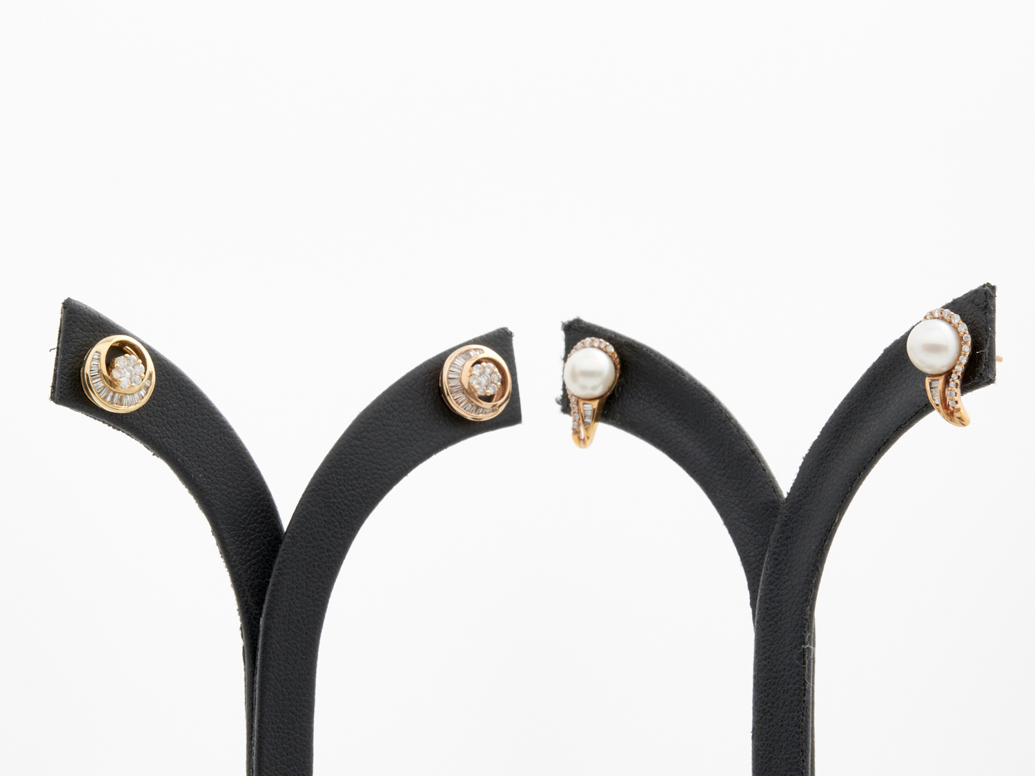 A PAIR OF PEARL AND DIAMOND STUD EARRINGS IN 18CT ROSE GOLD, TOGETHER WITH A PAIR OF DIAMOND CLUSTER EARRINGS IN 18CT ROSE AND YELLOW GOLD RESPECTIVELY, BOTH TO POST AND BUTTERFLY FITTINGS, 4.8GMS