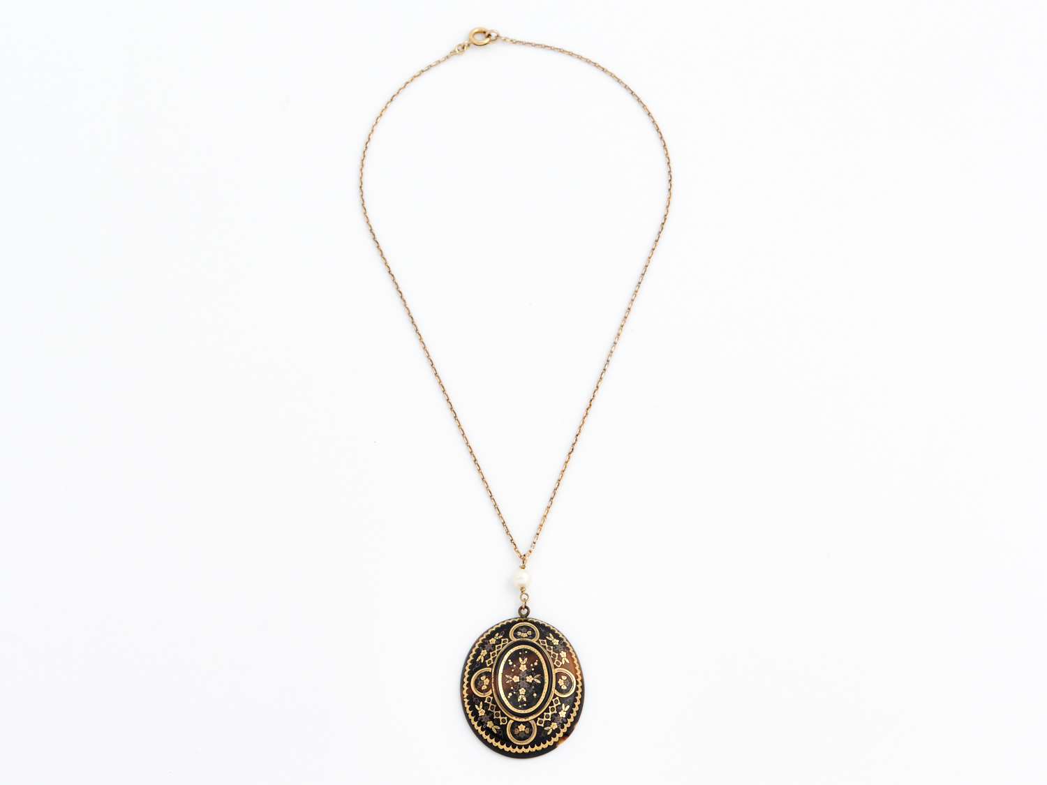 A VICTORIAN PIQUE AND PEARL PENDANT, MEASURING 40 X 35MM, TO A FINE TRACE CHAIN, LENGTH 380MM