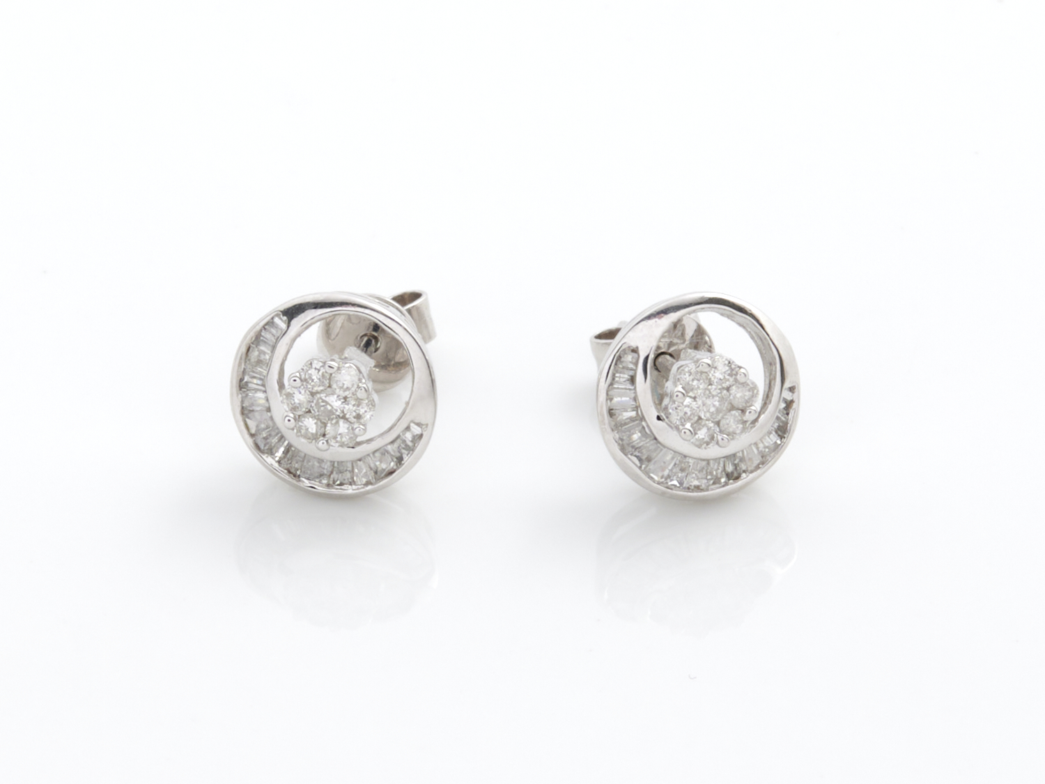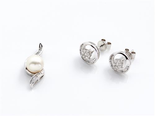 A PAIR OF DIAMOND CLUSTER EARRINGS IN 18CT WHITE GOLD, TOGETHER WITH A PEARL PENDANT IN 18CT WHITE GOLD, THE EARRINGS TO POST AND BUTTERFLY FITTINGS, 3.6GMS