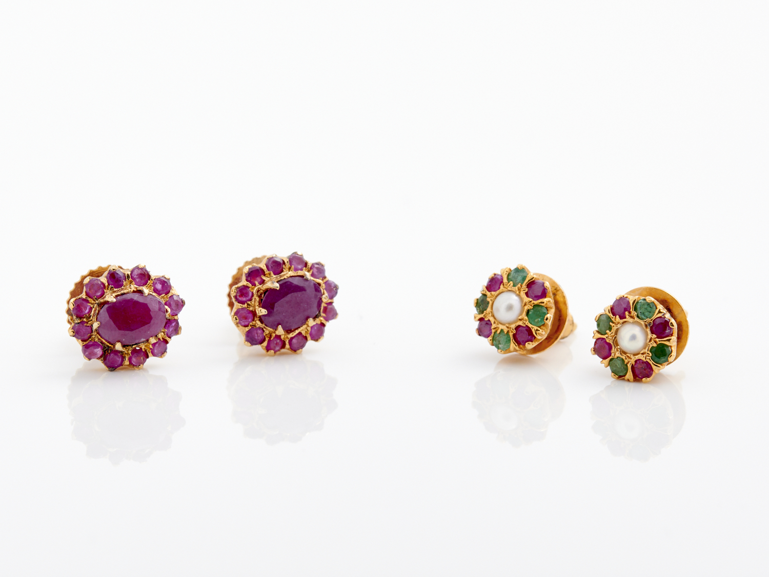 A PAIR OF RUBY CLUSTER EARRINGS, TOGETHER WITH A PAIR OF RUBY EMERALD AND PEARL CLUSTER EARRINGS, BOTH IN GOLD PLATE TO POST AND BUTTERFLY FITTINGS