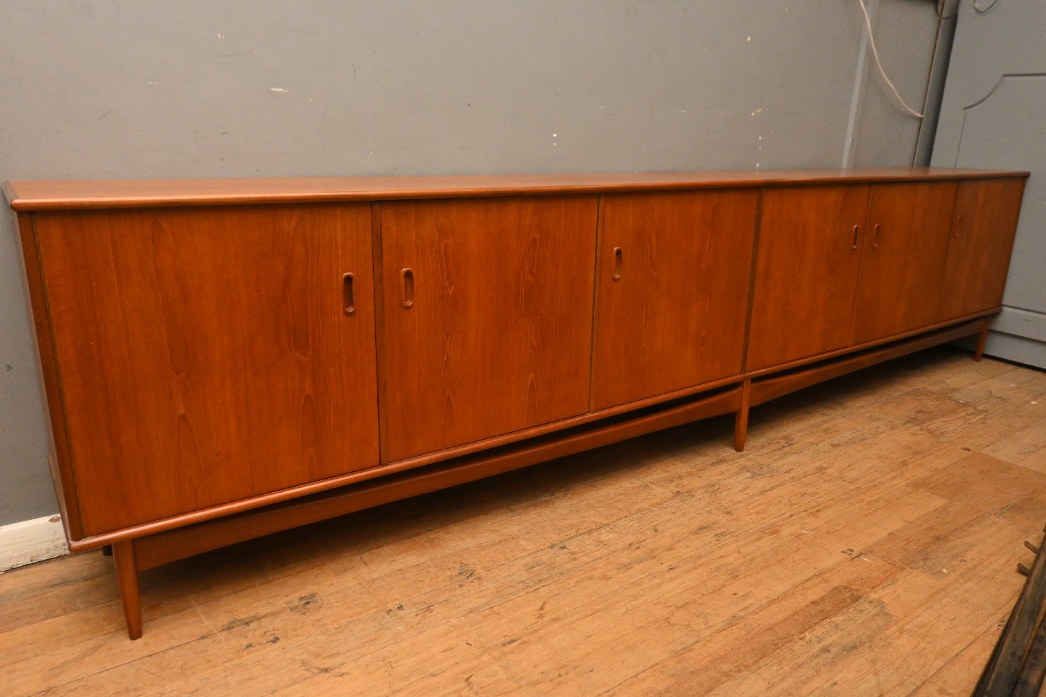 A SIX DOOR TEAK MID-CENTURY SIDEBOARD ON SLED BASE (85H X 360W X 46D CM) (PLEASE NOTE THIS HEAVY ITEM MUST BE REMOVED BY CARRIERS AT THE CUSTOMER'S EXPENSE. LEONARD JOEL STAFF WILL NOT ASSIST CARRYING THIS ITEM) (X-LARGE ITEM)