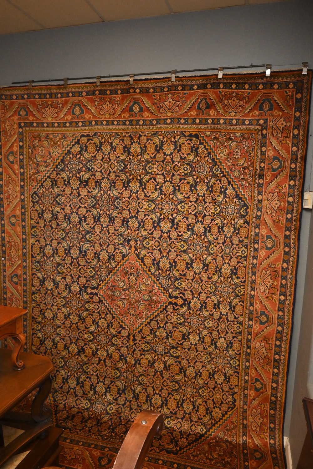 A 1970'S PERSIAN MAHALL RUG. 100% WOOL, NATURAL DYES. HAND KNOTTED CITY WEAVE WITH TRADITIONAL DESIGN OF CENTRAL DIAMOND MEDALLION ON A FILED OF ALL OVER HERATI MOTIFS IN BLUE AND GREEN TONES IN A ROYAL PERSIAN BLUE FIELD. UNIQUE BORDER OF URNS, GEOMETRIC AND TRIBAL MOTIFS. ALL OVER SOFT TUSCAN TONES. SIZE: 395 X 296 CM. ORIGIN: PERSIA - RRP: $5,200