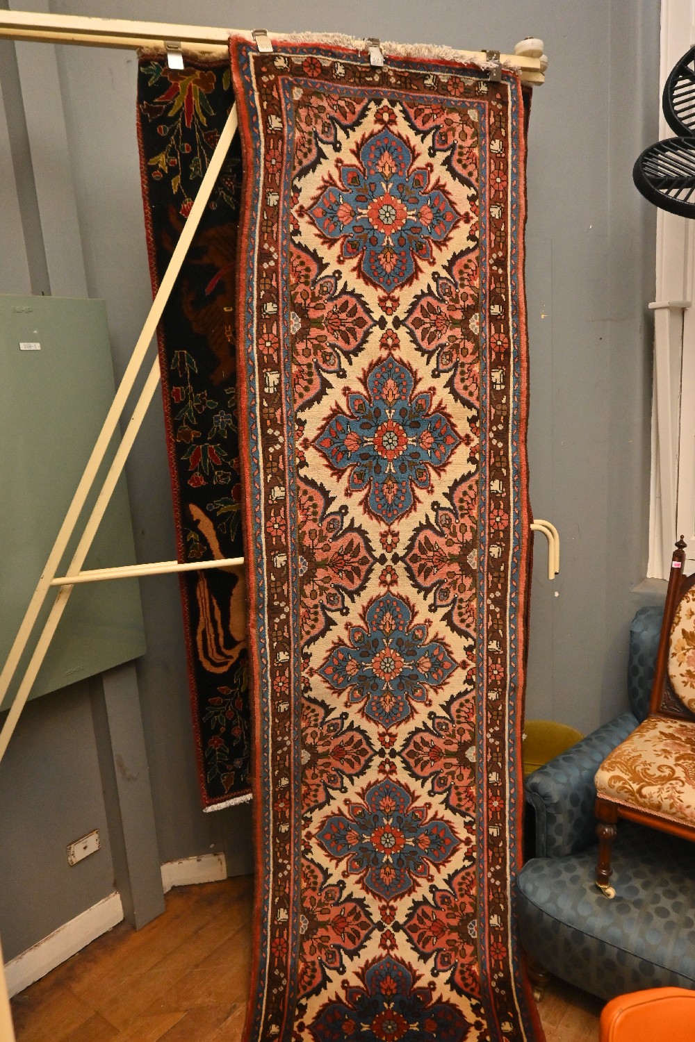 A PERSIAN MEHRABAN HALL RUNNER, 100% WOOL. DENSE- SOLID PILE. HAND-KNOTTED VILLAGE WEAVE WITH TRADITIONAL DESIGN OF CONTINUING FLORAL MEDALLIONS IN IVORY AND BLUE ON A SOFT RED FIELD OF HALF FLORAL MEDALLIONS. BORDER OF TRIBAL FLORAL MOTIFS. SIZE: 310 X 80 CM. ORIGIN: PERSIA - RRP: $1,300. DOCUMENTATION OF AUTHENTICITY INCLUDED