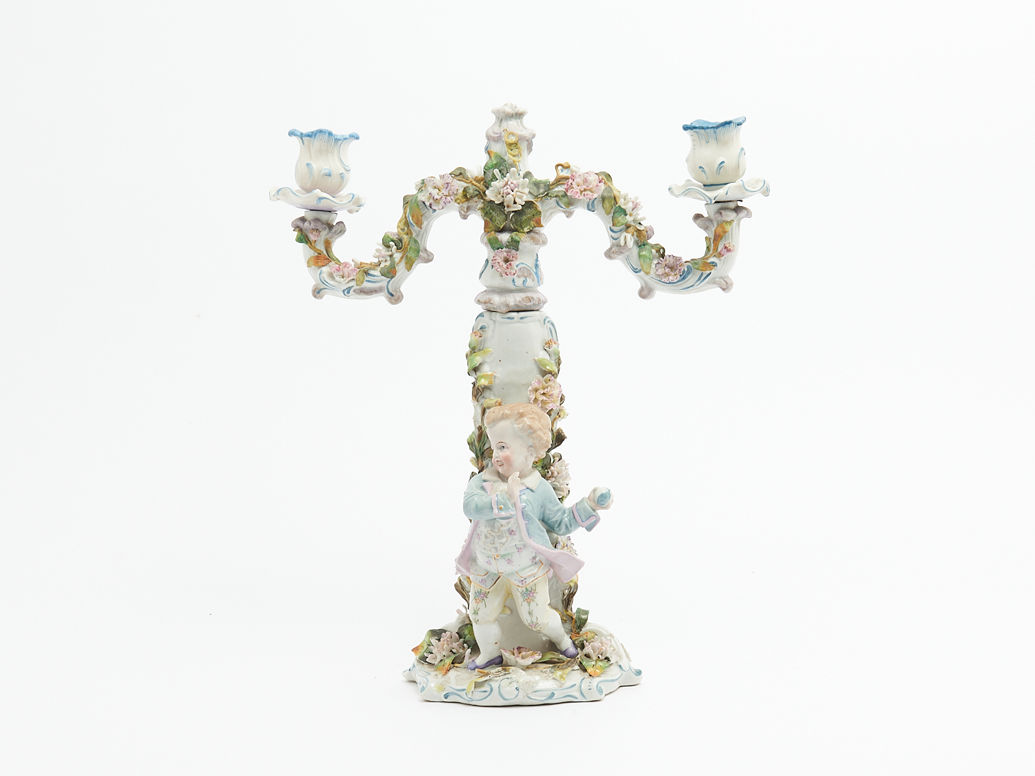 A GERMAN FIGURAL CANDELABRUM, PROBABLY SITZENDORF, 19TH CENTURY H.36CM, LEONARD JOEL LOCAL DELIVERY: MEDIUM.