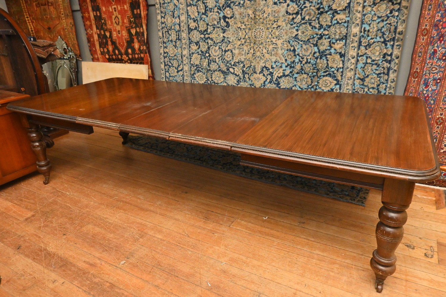 AN EXTENSION DINING TABLE WITH THREE LEAVES (A/F) (77H X 304W X 129D CM) (PLEASE NOTE THIS HEAVY ITEM MUST BE REMOVED BY CARRIERS AT THE CUSTOMER'S EXPENSE. LEONARD JOEL STAFF CANNOT ASSIST CARRYING THIS ITEM) (X-LARGE ITEM)