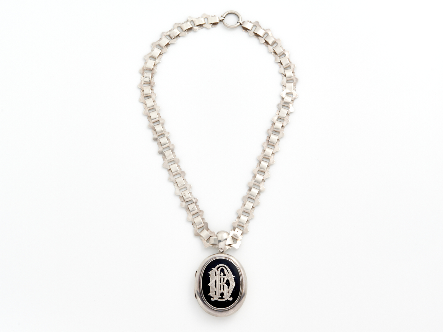 AN ENAMELLED LOCKET IN SILVER, TO A FANCYLINK COLLAR, LENGTH APPROXIMATELY 420MM, 49.4GMS,