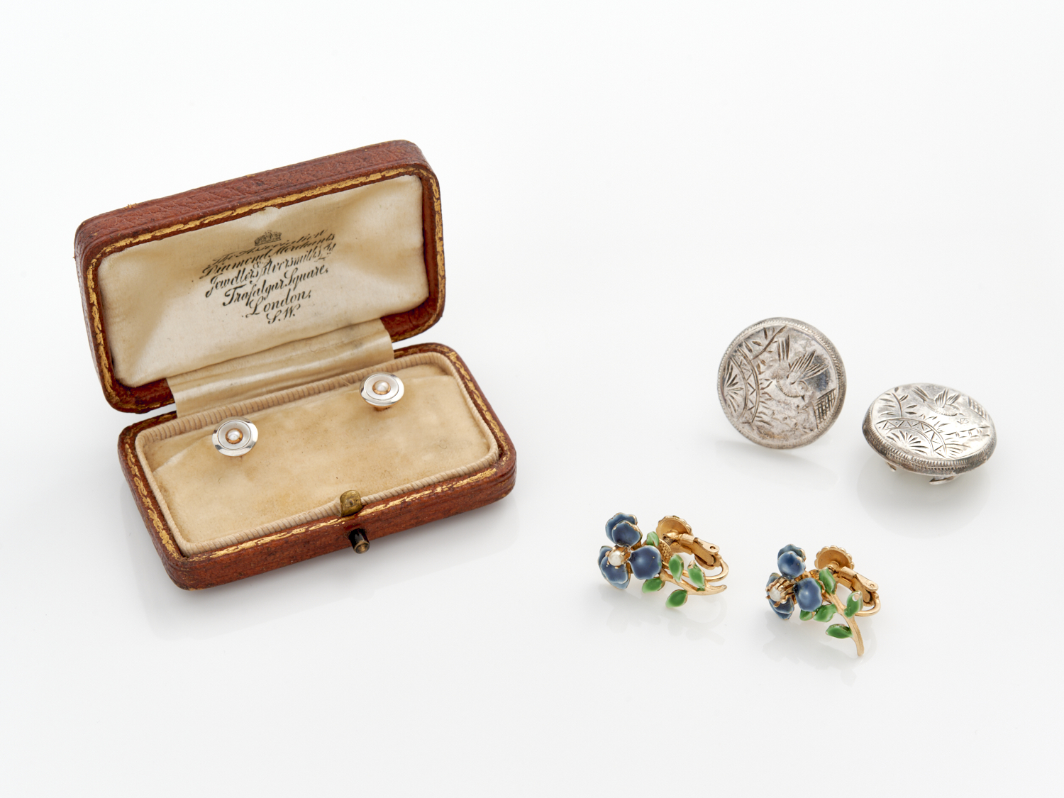 A PAIR OF SEED PEARL AND ENAMEL SHIRT STUDS IN 9CT GOLD, BOXED, TOGETHER WITH A PAIR OF SHIRT STUDS IN STERLING SILVER AND A PAIR OF ENAMEL AND SEED PEARL EARRINGS