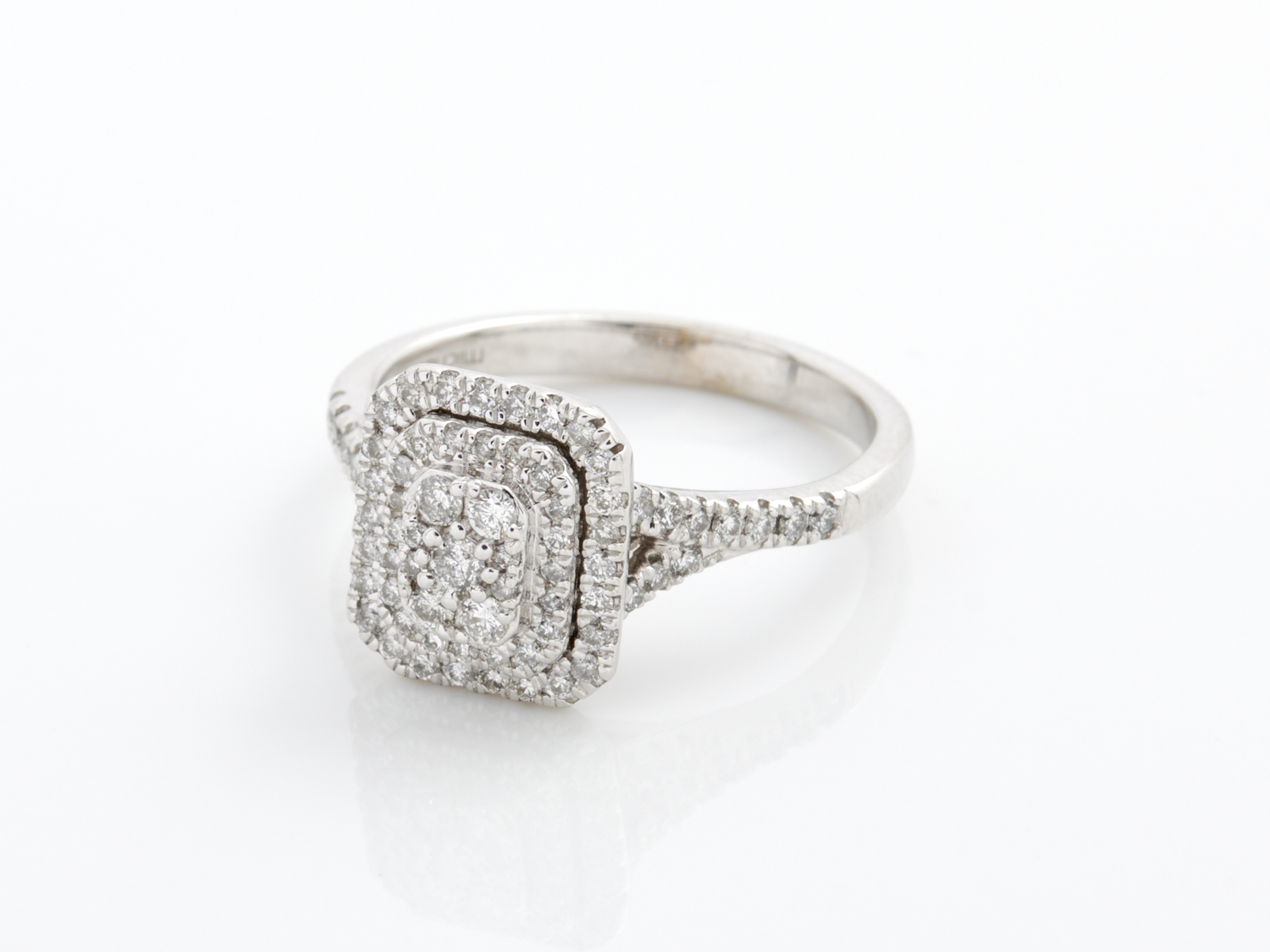 A DIAMOND CLUSTER RING IN 10CT WHITE GOLD, THE DIAMONDS TOTALLING 0.50CTS, SIZE M, 3.9GMS