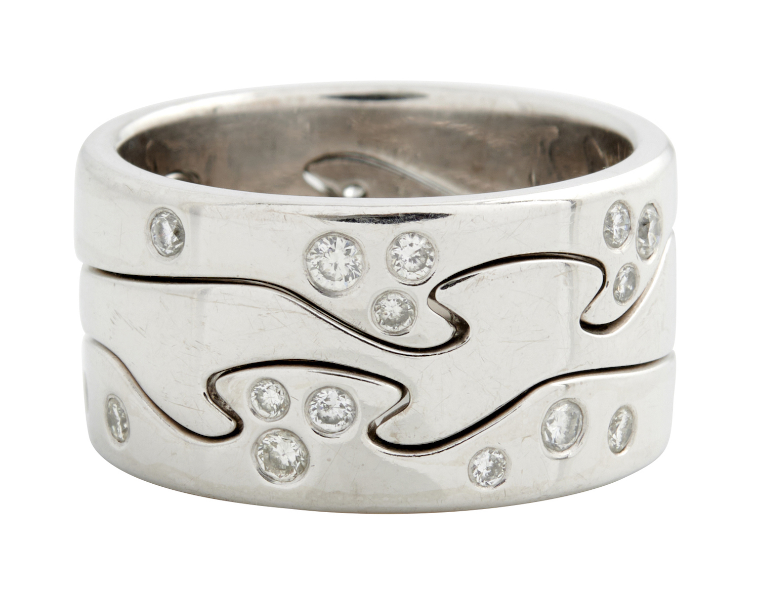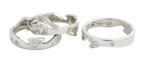 Comprising three interlocking bands, each hammer-set with brilliant diamonds together weighing approximately 0.57 carats, signed Georg Jensen, size N-O (55), accompanied by a Georg Jensen certificate.