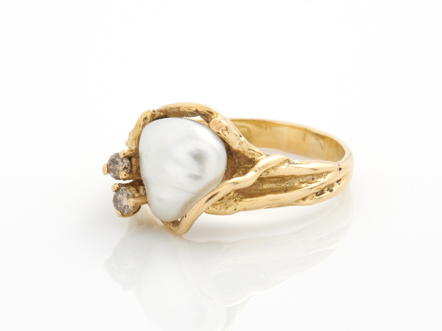 LINNEYS, KESHI PEARL AND CHAMPAGNE DIAMOND RING IN 18CT GOLD, SIZE M, 5.6GMS
