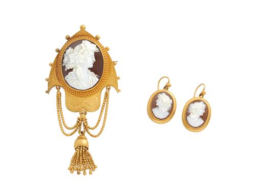 Comprising a brooch centring a shell cameo depicting a classical figure in profile, suspending swag and tassle decoration, glazed panel to reverse; earrings ensuite, each comprising an oval shell cameo depicting a classical figure in profile, with a gold border, to shepherd hook fittings in 18ct gold, brooch signed Gaunt, measuring approximately 90mm x 43mm, earring length approximately 32mm.