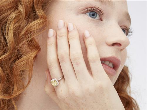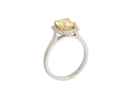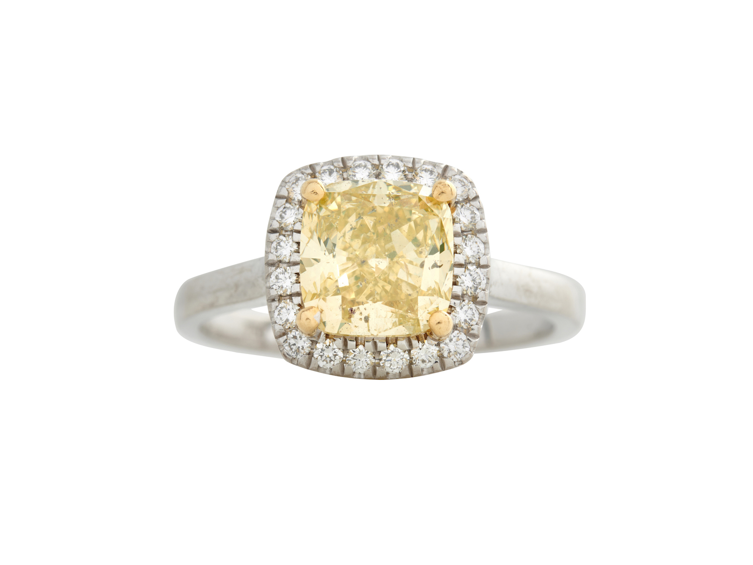 Of cluster design, centring a claw-set cushion-cut fancy yellow diamond weighing 2.06 carats, within a surround of twenty brilliant-cut diamonds together weighing approximately 0.20 carats, size P.