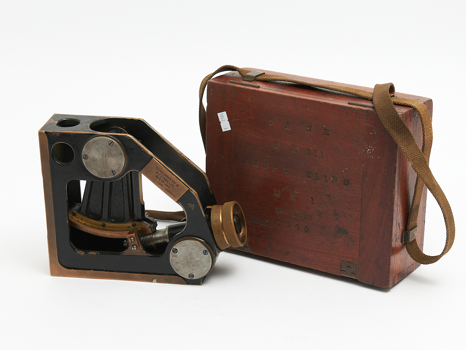 A WWII CLINOMETER MKIII, B.J. LYNES LTD, 1941 COMPLETE WITH ORIGINAL WOODEN BOX AND PAPERS. H.17.5CM, LEONARD JOEL LOCAL DELIVERY: SMALL