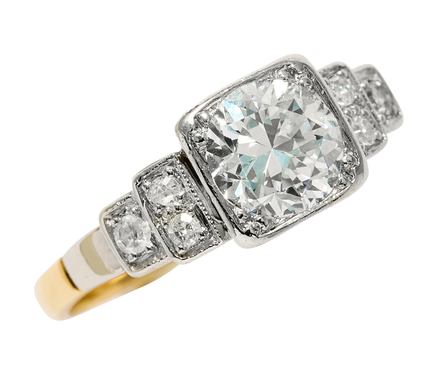 In our opinion, the diamonds are bright and lively, the round brilliant-cut diamond an estimated G colour and SI clarity, the single-cut diamonds an estimated H colour and Pique clarity, as gauged and graded within the limitations of the cutting style and the mounting. The mounting has wear to the metal in the form of some scratches.
