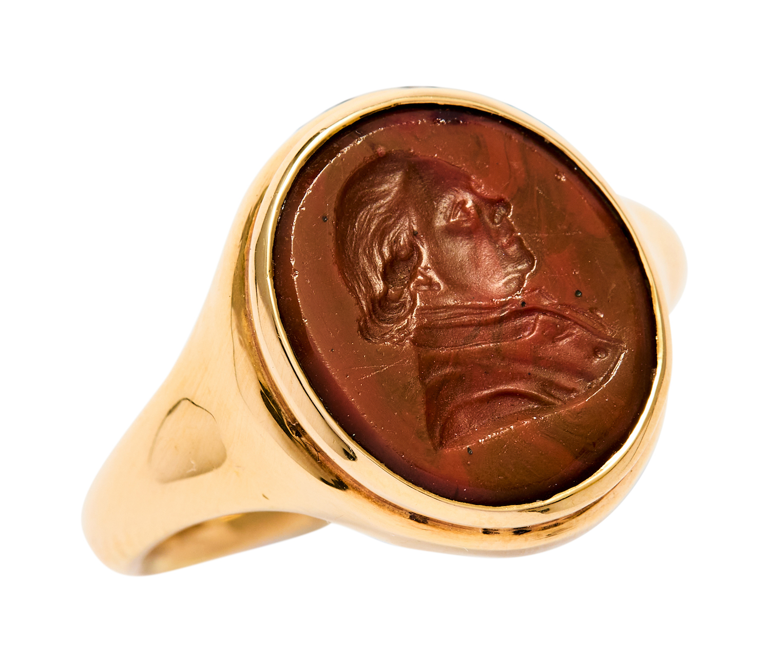 Depicting the portrait of a gentleman, the carnelian intaglio measuring approximately 13mm by 15mm, mounted in 18ct gold, size Z, total gross weight approximately 11 grams, British assay marks, maker's marks.