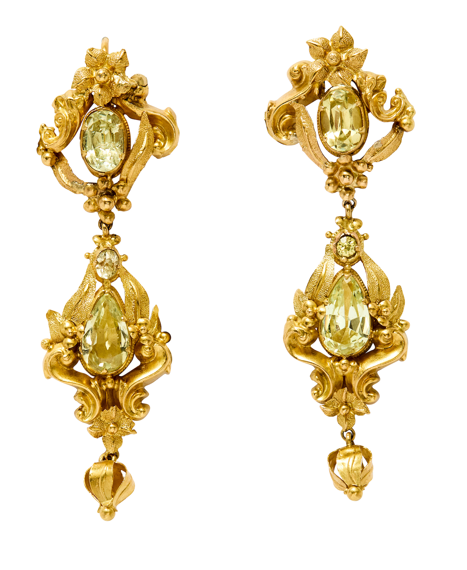 Each terminating in an articulated scrolled and foliate repoussé drop, claw-set with a foil-back oval-shaped and pear-shaped yellow chrysoberyl supported from a similarly designed respoussé surmount centring a further oval-shaped yellow chrysoberyl, the pear-shaped chrysoberyls measuring approximately 9mm by 6mm, mounted in 20ct gold, length 55mm, width 15mm, 18ct gold shepherd hook fittings, total gross weight approximately 8 grams.