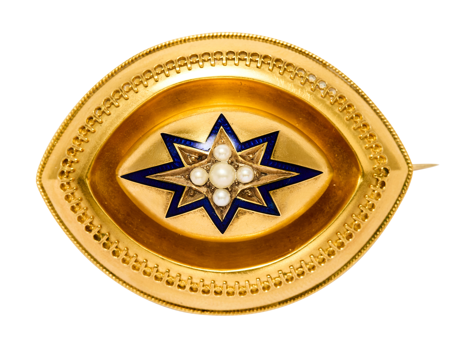 Of elliptical shape centring a cluster of bead-set seed pearls framed by an 8-point star applied with blue enamel completed by a convex decorative surround applied with granulation and ropework, the reverse with glazed photo compartment, mounted in 9ct gold, length 48mm, width 35mm, total gross weight approximately 17 grams.